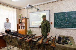 These weapons actually saw action in battles. Corrosion on metal is real, Rodion Romanov reminds high school students at another metropolitan school. Weapons were placed on several tables in the gym at school No. 18.