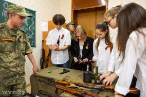 Activists from “Heirs of Victory” show how to cock the trigger, how to hold a machine gun correctly and how to better aim a pistol. They show how to avoid danger if a shell from the Great Patriotic War ends up in your grandmother’s garden or is found on a hike near a washed-out river bank. Fifth graders carefully record all answers. Not only in your own memory, but also in your phone memory. They are interested in taking pictures with pistols and bayonet knives, but it is more important to look at everything and learn something new. After all, the boys are still interested in military history even after 79 years.