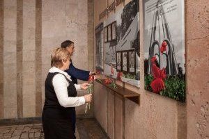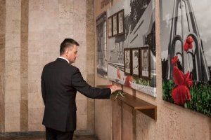 Vadim Krasnoselsky, put flowers to the memorial bench, which show important words "Remembering for the sake of life on earth".