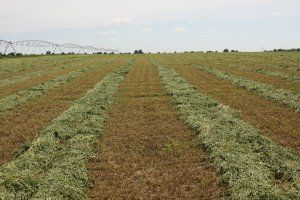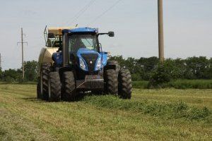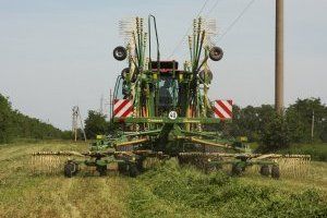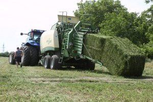 Alfalfa is grown at one of the fields of the Rybnitsa district. It is mowed five times during the season. Herbal mass goes to the preparation of hay. Thus, it is possible to provide an annual supply of this type of feed. First, the green mass is mowed. After this, the mown grass dries a few days. By the time of harvesting, it must retain a certain amount of moisture - no more than 60%. Then a special machine, swath, collects the mown grass in a comfortable roll. Behind him, a modern tractor pulls a baler that forms bales of hay. Each bale comes out about two meters in length and weighs over 700 kg.