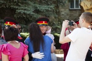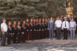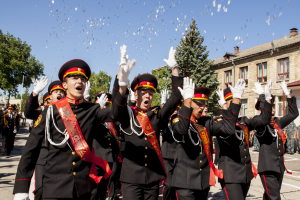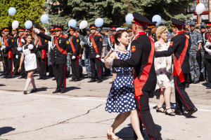 After the graduation ceremony, the graduates demonstrated skill of skillful possession of weapons. One of the most solemn and touching moments of the graduation is the farewell to the school banner. All five years of training the cadets were looking up to the banner. Today they took off their caps and bowed their knee, bidding farewell to the banner. Then all the students passed a solemn march. Graduates-cadets at parting toss coins into the air for happiness and shout out the short word "All!". The graduated ceremony ended with a traditional school waltz.