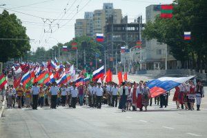 Day of Russia in Pridnestrovie, although not a day off, but a holiday. Thousands of citizens came to the main street of the capital to demonstrate unity with the great homeland. Representatives of enterprises, public organizations, authorities, people of different generations and nationalities took part in the festive procession from the Drama Theater to the central square of Suvorov. Russian and Pridnestrovian flags are in the hands of everyone. Many came to the holiday with their children and grandchildren.