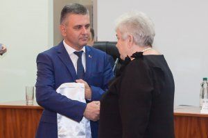 In the course of the solemn meeting, the chairman of the Women's strike committee Galina Andreeva was awarded the title "Honorary Citizen of the City of Tiraspol". The President presented the ribbon and the certificate to her. Galina Stepanovna stood at the origins of the republic's formation, took part in the fighting in 1992, in organizing the women's strike movement and the "rail war".