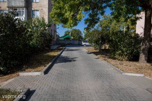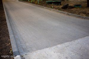 A large area near house No. 32 in 40 Let Pobeda Street was paved with paving slabs this year. A path was laid out from tiles along the playground in addition. Stories from residents about the old asphalt near the house, which caused many to fall, are a thing of the past.