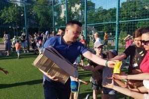 Traditional holiday at the constituency Number 31 "Krasnodonsky", timed to coincide with the International Children's Day, was held for the first time at the new sports ground of the capital's school Number 5. Children participated in sports competitions, watched a concert of children's groups and received prizes. All the children were given ice cream at the end of the holiday. The entertainment program was compiled by the employees of the Ecological Center for Students, the Center for Social and Educational Work and teachers of secondary school Number 5. The holiday was organized by the deputy of the Supreme Council for the constituency Number 31 "Krasnodonsky" Vadim Levitsky.